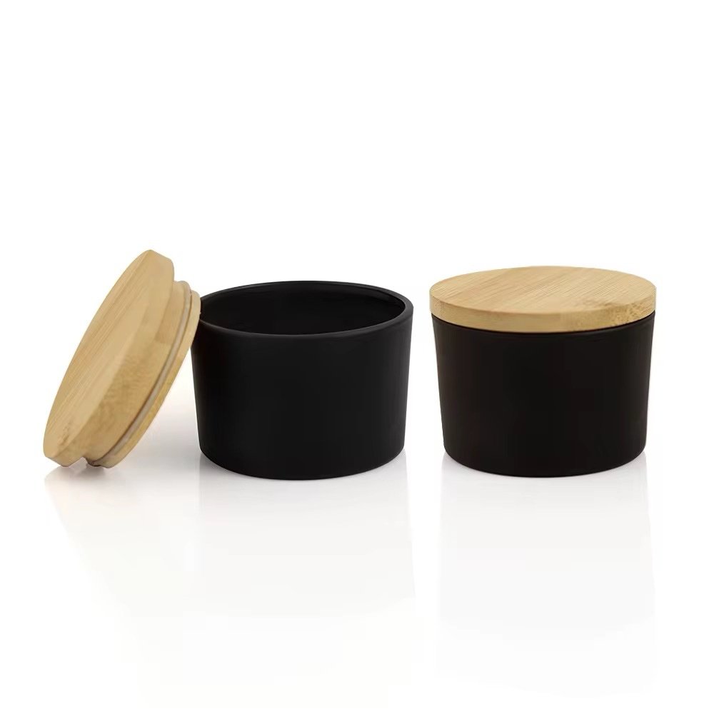 وعاء زجاج كبير لون اسود مع غطاء خشب بامبو